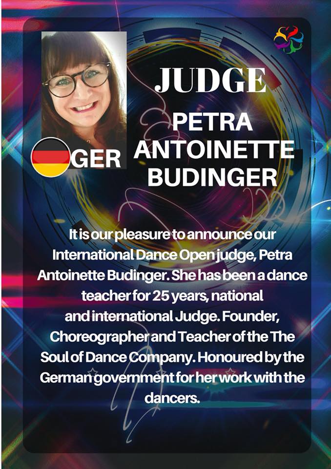 Als offizielle Wertungsrichterin wird Petra A. Budinger vor Ort sein. Unsere Solistin Ester wird gleich in vier Solokategorien dort an den Start gehen. Showdance - Moderndance - Contemporary und Discodance.